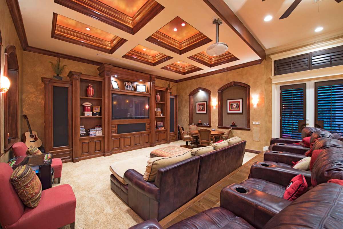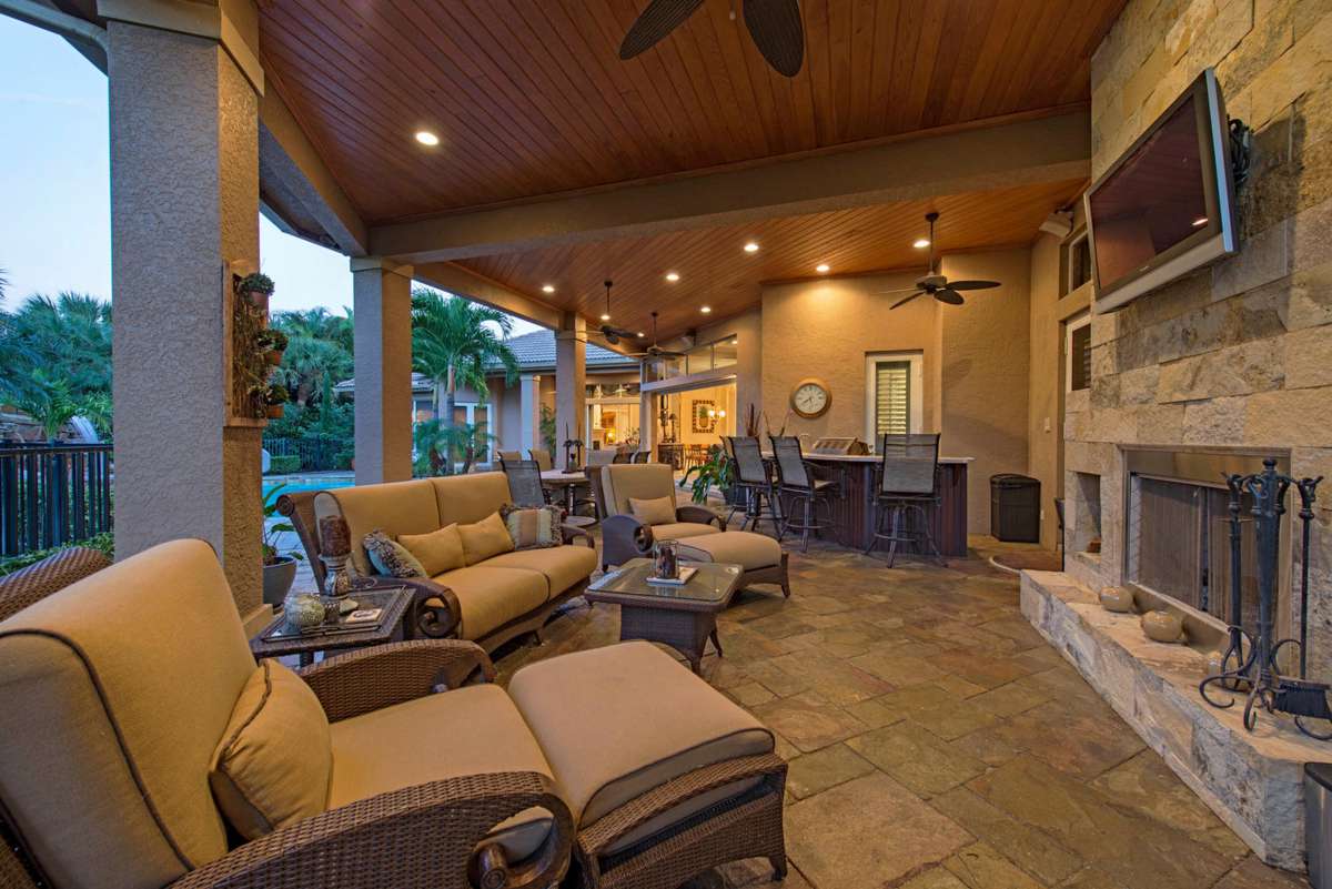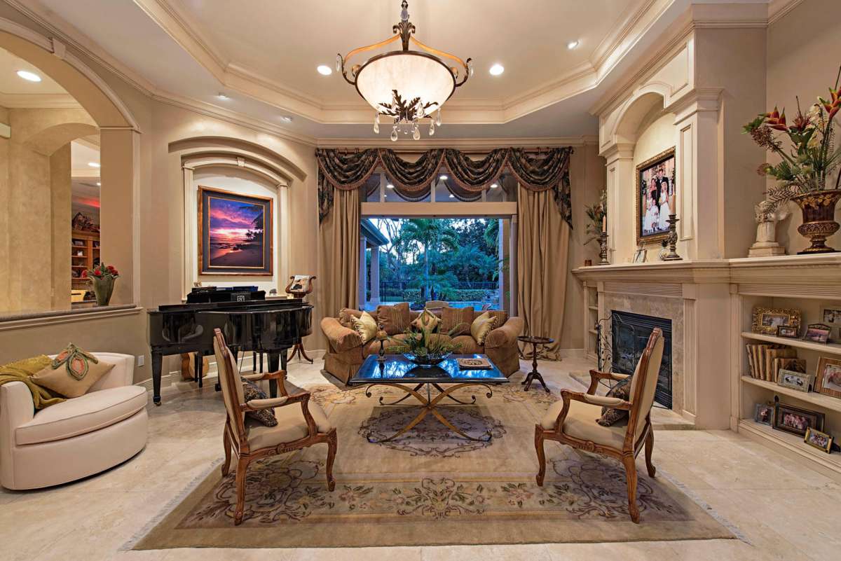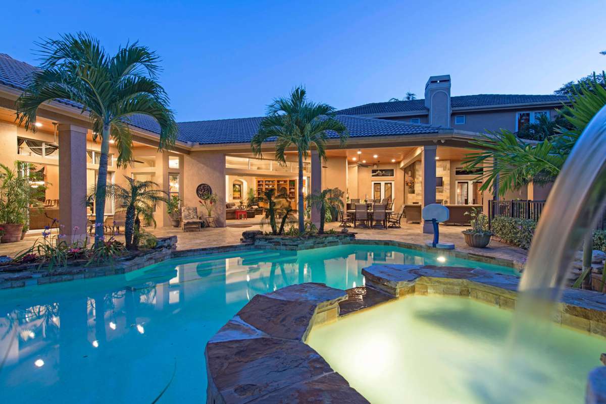 Magnificent estate home, rarely available in the highly sought after Stonegate at the Crossings located along the picturesque Orange Blossom Drive. This prestigious estate impresses above all with its interior layout and first-class appointment standard. The expansive and open plan ground floor level presents ample scope for instating and leading a luxurious style of living. This level also features an inviting entrance hallway with travertine flooring, solid cherry wood staircase leading to the second floor, oversized entertainment/game room with full service wet bar and exquisite mill work throughout overlooking the resort style spa, pool and waterfall with tropical lush landscaping. The property boasts over 8000 Sq Ft of gracious living, sprawling over .72 acre lot, 3 car garage, a gourmet and a summer kitchen, a private office, 3 indoor gas fireplaces and an outdoor wood burning fireplace under tongue and groove ceiling on the lanai. The estate’s amenities consist of a state of the art movie theater room with a 103″ drop down projection screen as well as a 70″ Sony Qualia built-in HDTV with McIntosh professional audio components, fitness room, spa and a charming lounge.